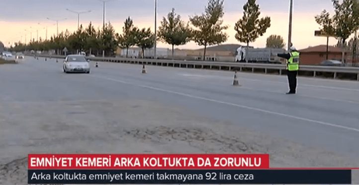 İçişleri Bakanlığı’nca, valiliklere gönderilen genelgeyle ticari taksiler dahil, otomobillerde arka koltuklarda oturanların da emniyet kemeri takma zorunluluğu hatırlatılarak, denetimlerin arttırılması talimatı verildi. Karayolları Trafik Kanunu’na göre, emniyet kemeri takmayanlara 92 lira para cezası, sürücülere ise 15 ceza puanı veriliyor