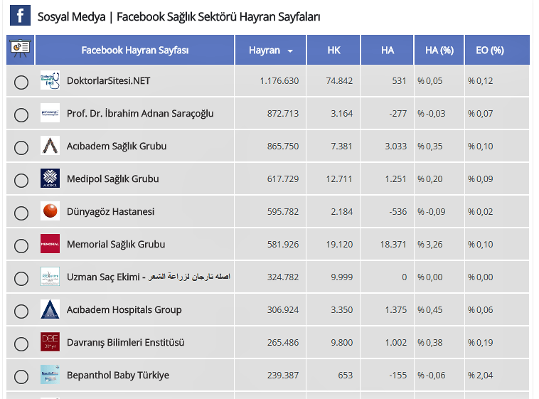 Bağımsız sosyal medya veri ve analizleri üreten ölçümlemeler yapan Boomsocial Sağlık Sektörünün en çok takip edilen facebook sayfalarını listeledi.