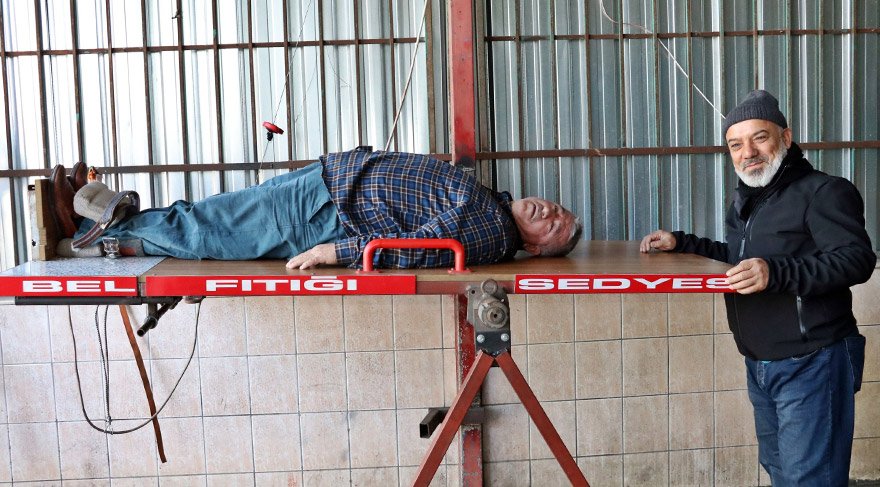 Mesleğinden ötürü yaklaşık 15 yıl önce bel fıtığına yakalandığını belirten İbrahim Tetikoğlu, daha sonra doktorlara gittiğini, ameliyatlık bir durum olmadığını öğrenince ise kendisi gibi bel ve sırt şikayeti olan vatandaşlara yardımcı olan şahıslara gittiğini söyledi. Burada tedavi olurken inversiyon aletlerini gördüğünü belirten Tetikoğlu, “Belcilere gittiğimde çok rahatladığımı gördüm. Ancak 1-2 sene sonrası işimizin ağırlığından dolayı nüksetti. Zaten kendim de demirciyim, internette araştırdım ve bu inversiyon aletini yaptım. Kendim bu alette 5’inci sallanmada rahatladım. Aleti kendim için yaptım ama sanayideki esnaf arkadaşlar ile kamyoncu, otobüsçü arkadaşlara da yardımcı oluyorum” dedi.Alet hakkında bilgiler de veren Tetikoğlu, “6 aydır 30-40 arkadaşımıza baktık. Yüzde yüz çözüm değil tabi. Fıtığı çok ilerlemiş olan hastaları doktorlara yönlendiriyoruz. Tıp gelişti, mikro cerrahi var. Son çare ameliyat olacaksa, olması gerekiyor ama ‘Dikkat edeceksin, ağır kaldırmayacaksın’ denilen arkadaşlarla ilgileniyoruz. Ayağından baş aşağı bağlıyoruz, kurduğumuz özel sistemle rahatsızlığı olan kişileri ters asıyorsun. Oradaki diskleri, omuriliğin arasına sıkışmış olan sinirlerin açılmasını sağlıyorsun. Zaten her insanın sabah akşam 3’er dakikadan da olsa baş aşağı sallanması gereken bir durum. Çok sağlıklısın diyelim, yine de her sabah yapması gerekiyor. Gelen arkadaşlara yardımcı olmaya çalışıyoruz” ifadelerini kaydetti.İşlem sonrası vatandaşların yorumlarıBel fıtığı başlangıcı yaşadığı için Tetikoğlu’na tedavi olmaya geldiğini söyleyen inşaat çalışanı 53 yaşındaki Orhan Karaalp, “Doktora gittim MR çekildi, belde incitme var ve bel fıtığı başlangıcı dediler. Doktor merhem veriyor, ağrı kesici veriyor ama değişen bir şey yok. 4-5 gündür sancılarım vardı, belimi incitmiştim. Arkadaşların tavsiyesi üzerine buraya geldim. Şuanda belimde hiçbir ağrı yok, yüzde 80, 90 ağrı azaldı. Hareketlerimdeki kısıtlama kalktı. Allah razı olsun kardeşimizden” diye konuştu.Doktorların daha önce bel fıtığı teşhisi koyduğu kamyon şoförü 57 yaşındaki Hasan Baba ise, “Belim ağrıyordu, soğuğu gördüğümde yürüyemiyordum. Burayı tavsiye ettiler. Daha önce doktora gittim, bel fıtığı olduğu söylendi ama ameliyat olmadım, burada 2-3 kere işlem gördüm ve daha önce yürüyemiyordum şimdi normal yürüyebiliyorum” dedi.