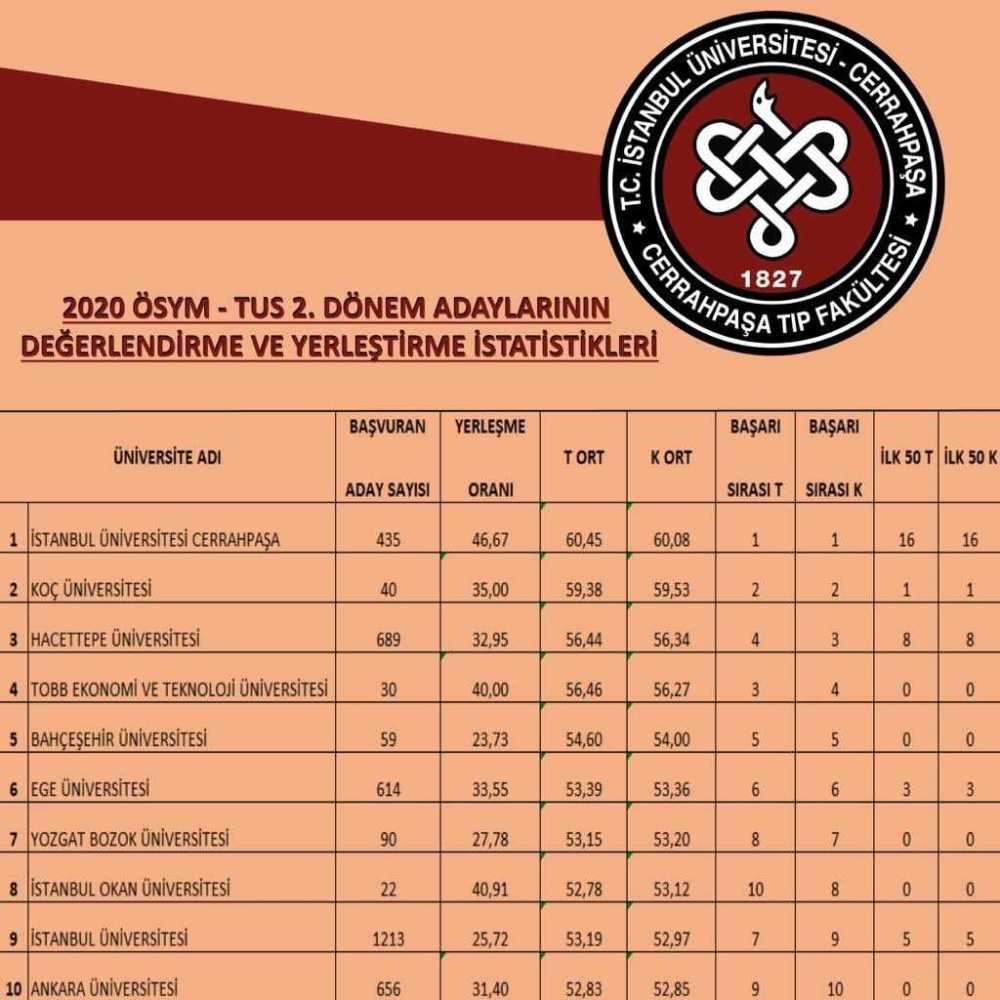 ÖSYM tarafından 4 Kasım 2020’de ilan edilen Tıpta Uzmanlık Sınavı 2. dönem sonuçlarına göre, kendisine ait olan ilk 10’da 5 öğrenci ile yer alma rekorunu daha da ileriye taşıyarak ilk 10’da 6 öğrenciye taşıyan Cerrahpaşa Tıp Fakültesi 4 Aralık tarihinde açıklanan yerleştirme sonuçlarında da en iyilerin tercihi olma geleneğini devam ettirdi.